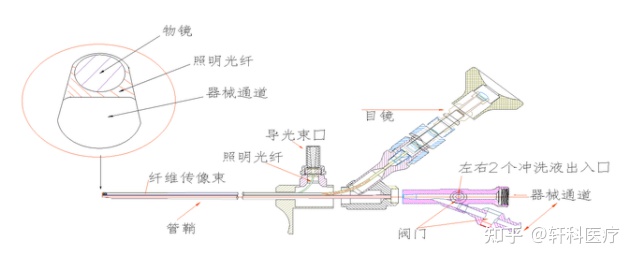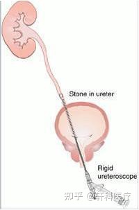 输尿管硬镜,由插入管、导光纤维束,导像纤维素,镜体(操作部分),器械通道,灌流通道组成。可以直接通过尿道进入输尿管来观察输尿管的病变情况,利用器械管导入器械,在持续灌流状态下进行碎石、取石等操作。