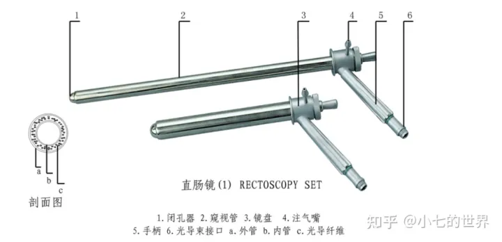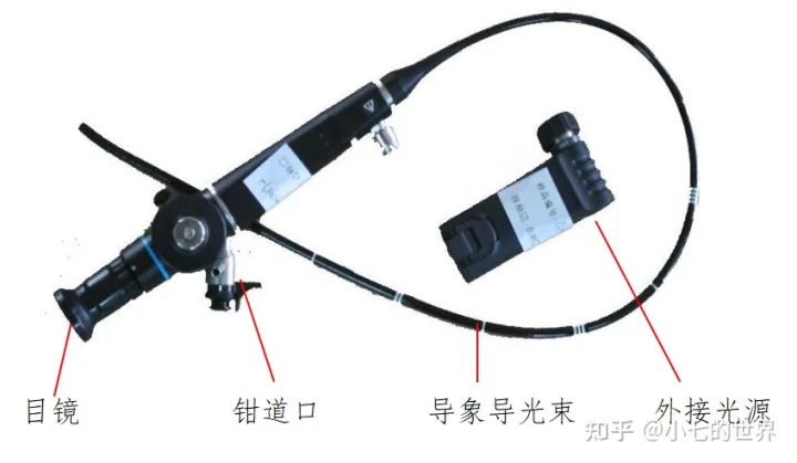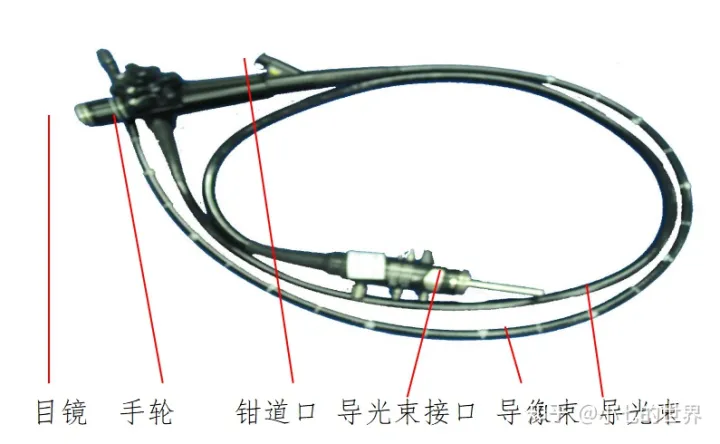 纤维内窥镜一般由目镜、手轮(软性或半硬性)、钳道口、导光束接口、导像束、导光束组成,有些产品还包括送水(气)孔、闭孔器等。