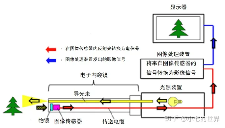 电子内窥镜系统一般包括内窥镜、图像处理装置、内窥镜冷光源、显示器和其他辅助设备。内窥镜冷光源发出的光通过光导接头导入内窥镜内,经过照明光纤和照明透镜,照射到黏膜上。头端部的图像传感器(CCD或CMOS)将接收到的黏膜反射光信号转换为电信号,通过电缆线传输到图像处理装置,图像处理装置接收来自内窥镜的图像信号并转换成影像信号,最终呈现在显示器的屏幕上。