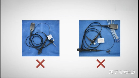 一手持导光插头和内镜电缆,另一手单独持软镜插入部,注意避免先端CCD的碰撞以及插入部的过度弯折。