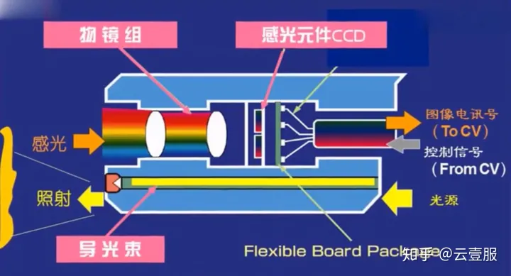 纤维镜的成像原理是由数万根极细的玻璃纤维(光纤)有序排列组成,单根光纤的传递只能产生一个光点,必须把大量的光纤集成导向束,才能把图像传递到另一端,一根光纤断裂图像就多一个黑点,电子镜先端有一个感光原件(CCD),将光信号转化为电信号传送到主机,故图像基本无损失。