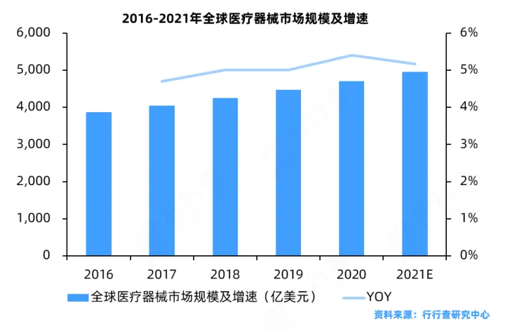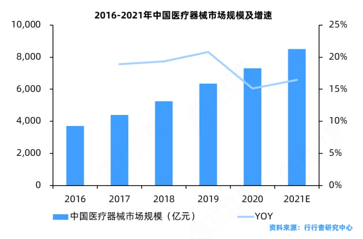 全球医疗器械市场发展极度不均衡,2020年全球医疗器械市场规模约为4,700亿美元,同比增长约为5%,北美是最大的医疗器械生产和消费区域,以市场规模估算,北美地区约占全球市场比重超过40%。其次是欧洲和亚洲,预计在30%和10%左右,其余地区市场的占比在20%左右。中国是全球第二大医疗器械市场,2016年到2020年,中国医疗器械市场规模从3,700亿元增长至7,300亿元,年均复合增长率超过15%,增速超出全球市场同期水平。当前我国处于医疗器械行业快速发展的黄金时期,预计到2022年中国医疗器械市场规模将超过9,000亿元。