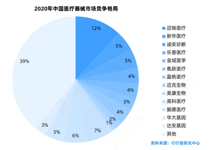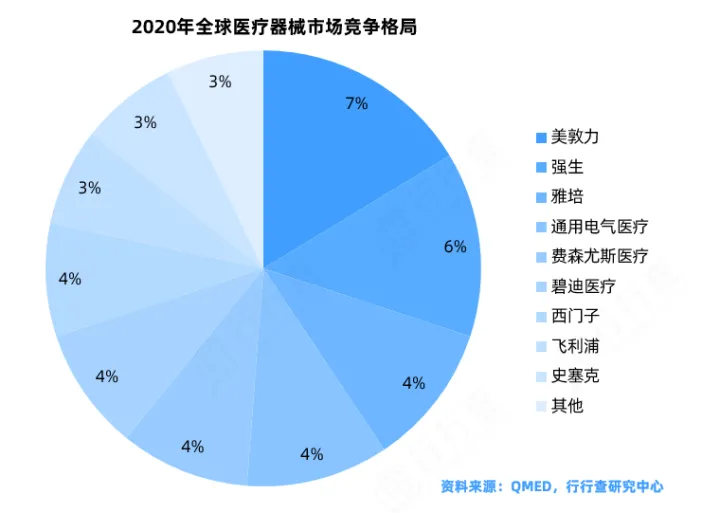 据国外权威第三方网站QMED发布的数据统计,2020年全球医疗器械市场中,美敦力、强生、雅培三家头部企业市场占比分别达到6.82%,5.73%和4.41%,CR3占据全球医疗器械细分市场的16%。受益于经济水平的发展、国家政策的支持和居民健康需求的增加,我国医疗器械市场保持增长趋势,发展前景广阔。与全球市场相比,我国医疗器械行业呈现整体分散、趋于集中的竞争格局。目前行业集中度仍较低,迈瑞医疗、新华医疗、迪安诊断、乐普医疗等企业市场竞争力较为突出。
