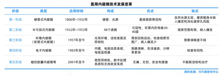 内窥镜经历了早期硬管式内窥镜、半可屈式内窥镜、纤维内窥镜、电子内窥镜、磁控胶囊内窥镜等发展阶段。1806年德国医生Bozzini发明硬管式内窥镜检查膀胱和尿道,标志着内镜应用的开端,最初的内窥镜是用硬质管做成的。后来,在20世纪50年代内窥镜用软质管制作,因而能在人体内的拐角处轻易地弯曲。而现代意义的内窥镜检查是随着光导纤维内窥镜的发明而逐渐形成的,能够同时拍摄照片的内窥镜是诞生于1964年的纤维内窥镜。1973年,激光技术应用于内窥镜的治疗上,并逐渐成为经内窥镜治疗有消化道出血的手段之一。1981年,内窥镜超声波技术研制成功,这种把先进的超声波技术与内窥镜结合在一起的新发展,大大增加了对病变诊断的准确性。1987年,PhillipeMouret首先开创了电视内窥镜手术。1983年,一种新型的电荷耦合器件(CCD)内窥镜是由美国纽约州的韦尔奇艾林仪器公司首先研制成功的。2002年11月,世界上首台“高清晰内窥镜系统”诞生。2013年,磁控胶囊胃镜系统研制成功,通过严格的多中心临床研究检验,这一系统在当年进入市场,成为全球首台用于临床的磁控胶囊胃镜,真正实现无创无痛无麻醉的胃镜检查。
