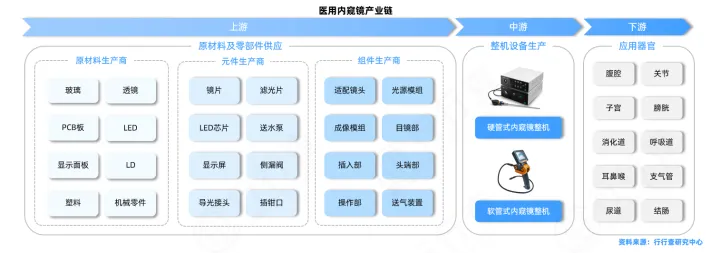 内窥镜组件生产技术壁垒较高,上游为玻璃、透镜、PCB板等原材料供应商,数量较多、成本稳定。而内窥镜元器件制造企业主要负责将原材料生产为内窥镜的核心组件。硬管式内窥镜(硬镜)主要包括三部分核心组件:镜头、光源和成像三大模块。各模块生产工艺复杂,均有较高技术壁垒。软管式内窥镜(软镜)主要包括以下核心部件:内镜主机、镜体、送气装置、送水泵等。下游根据病症产生器官不同,进行各类手术,用到诸如喉镜、鼻镜、子宫镜、结肠镜等内窥镜设备。