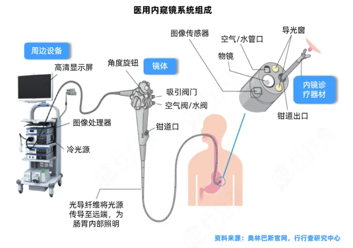 医用内窥镜主要由三大系统组成,分别为窥镜系统、图像显示系统、照明系统。以目前较为常用的电子内窥镜为例,镜体伸入患者体内,镜体内部并列多个管道,包括照明光纤、传像光纤、传气通道、传水通道、器械通道等,内窥镜精密度极高,需要多个专业领域相互配合。