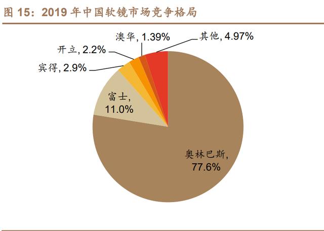 软镜领域,垄断现象突出,日本外资国内份额超 9 成,国内挑战者不如硬镜 多,但在中高端已出现有力进口替代选手。国内软镜市场被国外厂商主导,2019 年奥林巴斯、富士和宾得三家占有国内 90%以上的市场,其中奥林巴斯更是一家 独大,垄断 77.6%的市场。国际品牌由于技术以及渠道等先发优势,在高端软镜 市场对后来者提出较高的准入要求。时至今日,我国大部分医用内窥镜生产企业 已经具备低端医用内窥镜产品生产与研发能力,部分大型企业在中端医用内窥镜 市场占据一定份额(如上医光、深圳开立、上海澳华),少数企业在部分医用内窥 镜细分领域的高端市场实现零的突破,如开立、澳华陆续推出 HD550、AQ200 等 高清内窥镜产品,填补国产高清内窥镜的空白,带动国产内镜份额提升迅速,尽 管占比还较小,但已当属国产头部软镜公司。