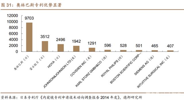 技术创新并形成专利护城河,夯实领先地位。奥林巴斯确立 NBI 光学染色和 放大内镜等技术优势,迅速形成专利壁垒和行业标准,专利到期之前下一代专利 池壁垒已经层层叠加。据日本专利厅调查报告,在全世界内窥镜整体专利企业排名中(1971- 2012 年优先权),奥林巴斯以 9703 件遥遥领先,在内窥镜细分的 7 大具体技术领域——插入、观察摄像、电子内窥镜、处置、收纳、防止感染以及 通用技术等,奥林巴斯的专利数量均排名第一。总体看内镜三强专利拥有量占到 十大企业的 73%,因此内镜专利很大程度上构成了内镜的高壁垒。(报告来源:未来智库)