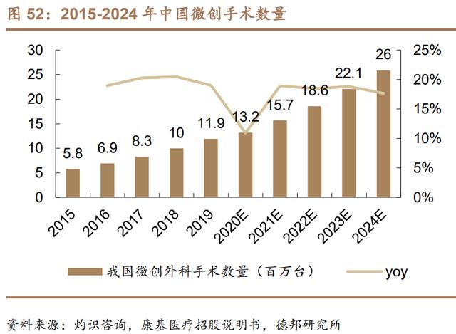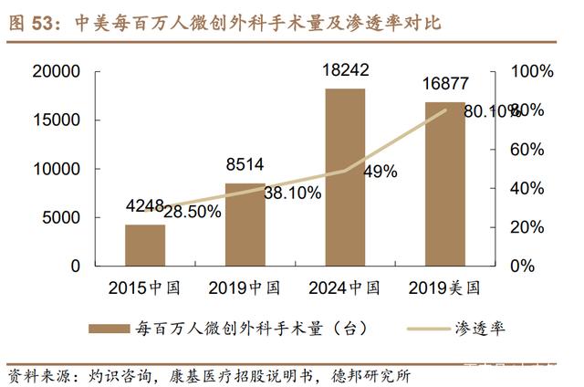 国内微创手术渗透提升空间大,加速微创大时代到来。我国微创外科手术量 2019 年接近 1200 万台,2015-2019 年 CAGR19.5%,预计从 2020 年开始将以 18.5%的均速增长至 2024 年 2600 万例。从人均微创外科手术来看,横向看,2019 年我国百万人接受的 MIS(微创外科手术)数只有美国同期的 1/2,在外科手术中 的渗透率中国只有 38%,相比同期美国 80%渗透率,还有至少一倍的提升空间。 纵向看,从 2015 年至 2019 年,我国百万人 MIS 数量一路从 4248 台提高到 2019 年的 8514 台,随着患者认知、负担能力提升及医师资源补充,灼识咨询预计, 2024 年我国百万人百 MIS 或将提高一倍至 18242 台,且 2024 年对应的 49%渗 透率距离 80%的美国当前数据,依然还具有一定差距。因此我们认为,国内微创 大时代已来,预计未来的 5-10 年将开启加速渗透模式。