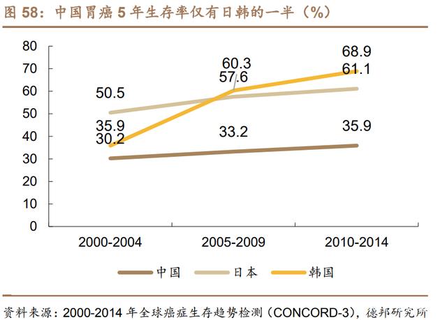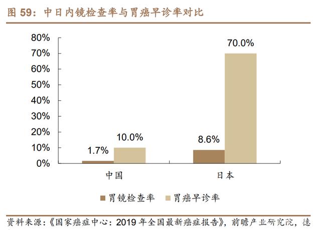 我国消化道癌症早筛仍有巨大提升空间。2010-2014 年中国的胃癌 5 年生存率稳步提升,但相比 邻国日韩,几乎只有一半。日韩的胃癌生存率主要得益于开展广泛的胃癌早筛, 根据健康界胃癌防治结论,胃癌患者如果在癌细胞扩散之前接受诊断和治疗,5 年 生存率为 68%;如果癌症转移到胃的深层组织,则生存率减少到 31%;一旦胃癌 到达远处的器官,生存率就下降到 5%,因此早期诊断是改善胃癌发展的关键。推荐筛查的起始年龄为 50 岁,依据过去日本和韩国的相关研究,将筛查间隔设为 2-3 年。日本每年大约有 11% 的人做了胃 镜检查,平均每五年就相当于有 50% 的人至 少做了一次胃镜检查。相对而言,我国胃癌、食管癌等消化道癌症的早期诊断率 仍不到 10%,相邻的日本和韩国的诊断率分别高达 70%和 55%,相比之下我国 消化道癌症早筛提升空间巨大。