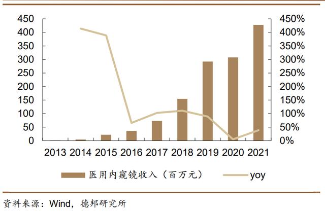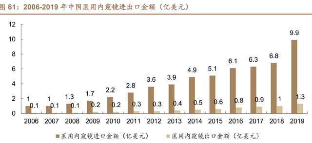国内内镜边际需求显著提升。海关数据显示,我国内窥镜进口、出口金额均 呈现上升趋势,但进口金额远超出口金额,贸易逆差呈现逐年扩大的趋势。侧面 反映随着国内内镜检查的普及,内镜行业整体需求处于加速释放的阶段。很多进 口的品牌供应链在品牌所在国,疫情影响交货周期,国产厂商供应链基本自主可 控的前提下,当前大环境给国产厂商创造了进口替代的窗口期。