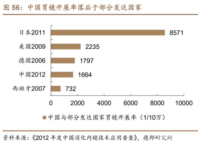 与发达国家尤其是与日本相比,国内内镜展开率差距明显。中国 2012 年每 10 万人胃镜开展量仅 1664 人,甚 至略低于德国 2006 年的 1797 人,远远落后于日本 2011 年的 8571 人。2012 年 肠镜开展率仅 435.98 人/10 万人,相比于美国 2009 年的 3725 人,仍相去甚远。 机构硬件和医师资源也还存在较大的差距,据《2020 中国消化内镜技术普查》,我 国每 100 万人开展消化内镜的医疗机构为 5.29 家、医师为 28.12 人,而日本的分 别为 164.7 家、191.2 人。随着国内老龄化的发展,人们对于早期消化道疾病预防 和治疗的需求越来越强烈,将推动国内软镜市场的快速发展。