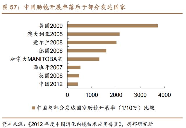 结构性来看: 1)国内消化道内镜在基层医疗机构普及率增长空间较大。《2021 中国县域医 院消化内镜基本情况调查》显示,参与调查的县域医院当中,开设消化内镜的有 4730 家,占比 86.5%;上海、北京、浙江,平均胃肠镜室配置数最高;但从整体 医疗机构的消化道开展率看,我国开展消化内 镜诊疗技术的医院占比仅为 27.88%。我们认为二级及以上医院开展率较高,基层 医院的消化内镜受制于医师缺乏及设备不足开展率依然较低。根据中华医学会消 化内镜峰会的技术下沉普及的指导,基于内镜的分级诊疗,门诊检查、二级手术 向下一级医院下沉,推动基层、民营、社区包括卫生中心采购内窥镜用以检查和 简单治疗,下沉市场有望成为内镜较大的增量市场。