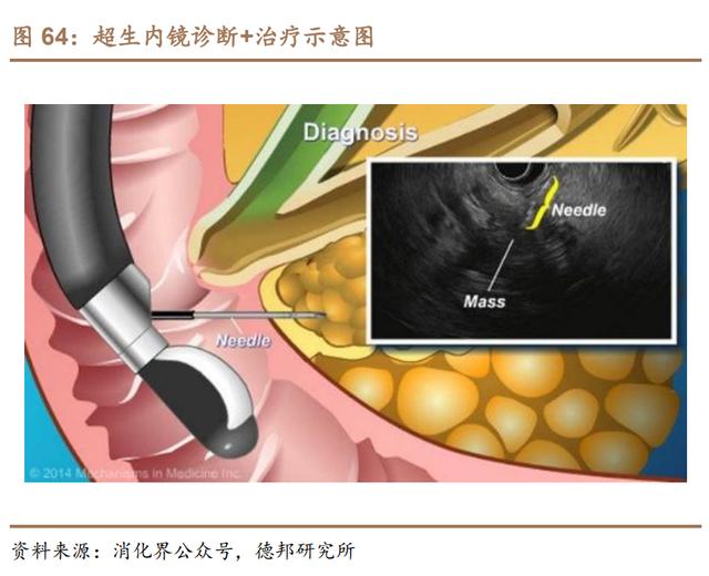 内镜+超声融合创新,超声内镜助力黏膜下的精确诊断+治疗。通常消化道可 以分为 4 层,从内到外依次为黏膜层、黏膜下层、肌层、浆膜层。由于常规胃镜 和肠镜是肉眼可见光成像,在消化道管腔内对消化道黏膜和病变的表面进行观察, 超声内镜将内镜与超声相结合,将超声探头置于内镜(胃镜、结肠镜)前端部或经内 镜导入微型超声探头,通过内镜观察粘膜表面的病变形态,通过超声扫描可以清 晰显示消化道壁各层组织结构及周围脏器(食管、纵膈、胃、十二指肠、胰胆系统 和肾上腺等)的良恶性病变。除检查功能外,超声内镜具有精确的进行穿刺、引流 等治疗功能,胰腺假性囊肿及脓肿可以在超声内镜引导下放置引流管、支架进行 内引流,或通过超声内镜引导向囊腔内注射药物治疗等等,大幅扩展内镜的临床 应用范围,弥补常规内镜的不足。