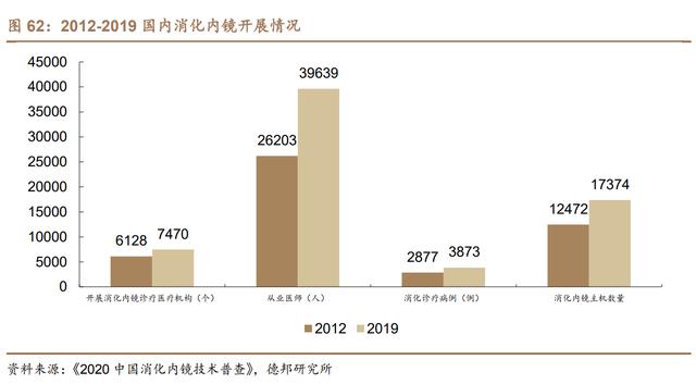 纵向来看,国内消化道内镜普及率显著提升。2012-2019 年,我国消化内镜学科得到显著发展。开展消化内镜诊疗的医 疗机构从 6128 家增长至 7470 家,增长率 21.9%;从业医师人数由 26203 人增 长至 39639 人,增长率 51.3%;2019 年全国共开展消化内镜诊疗 3873 万例,较 2012 年增长 34.6%。2012 年至 2019 年我国消化内镜设备保有量大幅度提升, 其中消化内镜主机数量由 12472 台增长至 17374 台,增长率 39.3%。硬镜主机的 配置增速超开展机构增速,表明单机构的内镜渗透率增加。