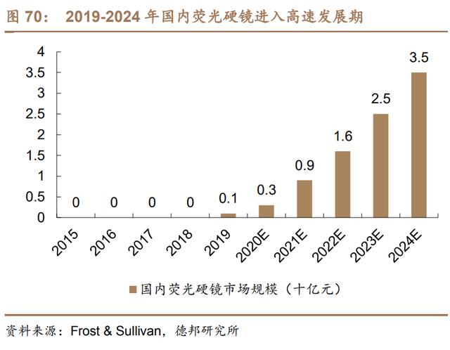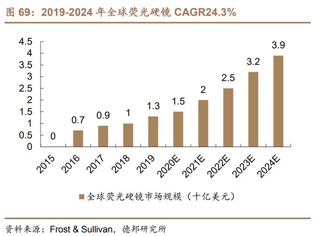 荧光内镜崛起之势,国内外均进入高速发展阶段。当前荧光主要用于硬镜, 2019 年全球荧光硬镜的市场规模达到 13.1 亿美元,预计未来将呈现高速增长, 以年均 24.3% CAGR 增至 2024 年的 38.7 亿美元。相较于全球荧光市场,我国荧 光硬镜发展相对滞后。随着进口品牌的产品推广、我国企业的技术研发创新、相 关荧光产品的获批上市等,预计未来我国荧光硬镜市场将进入高速增长期,2024 年总体市场规模将快速增长至 35.2 亿元。全球来看,荧光硬镜占总体硬镜市场比 重由 2019 年 22.9%预计将快速提高至 53.5%;国内荧光硬镜占比更是有望迅速 从 0 迅速提升至占 32%。
